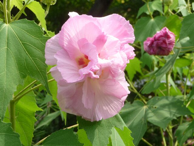 円町の交差点から西大路通を北上し下立売通を右折、少し進むと紙屋川沿いの東畔に「だるま寺」はあり、門を入ると左手にピンクや白など芙蓉の一群があった。