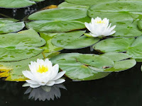 白虎池に映るサツキとハナショウブ(左)とスイレンが美しかった。