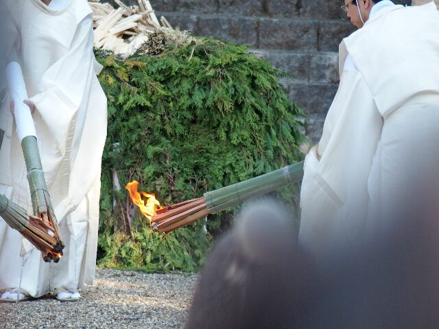 祭場では「大祓詞(おおはらえことば)」の声が響き渡る中、神職が炎の中に手際よく火焚串を投げ入れていった。